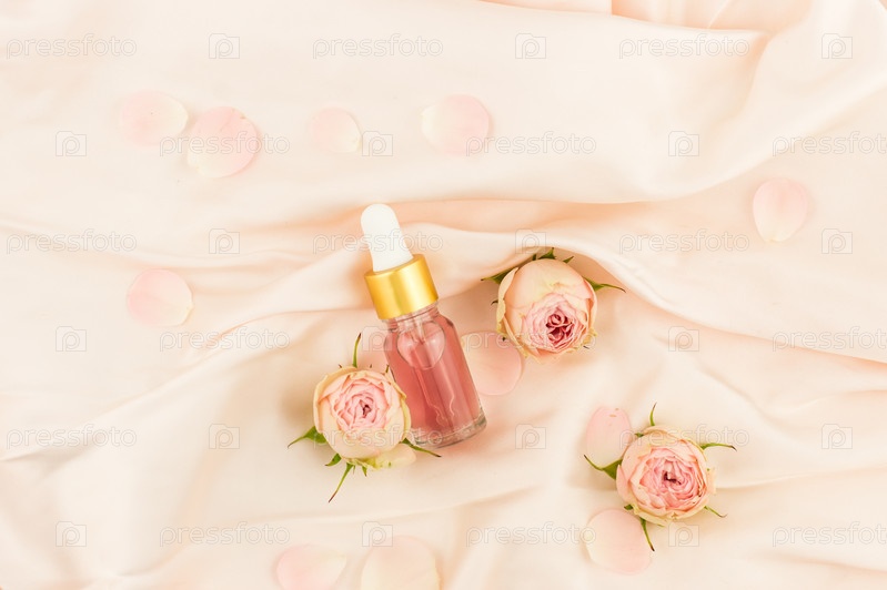 Натуральный косметический продукт. масло из лепестков розы в стеклянном фламоне с капельницей на пастельном текстильном фоне с бутонами роз