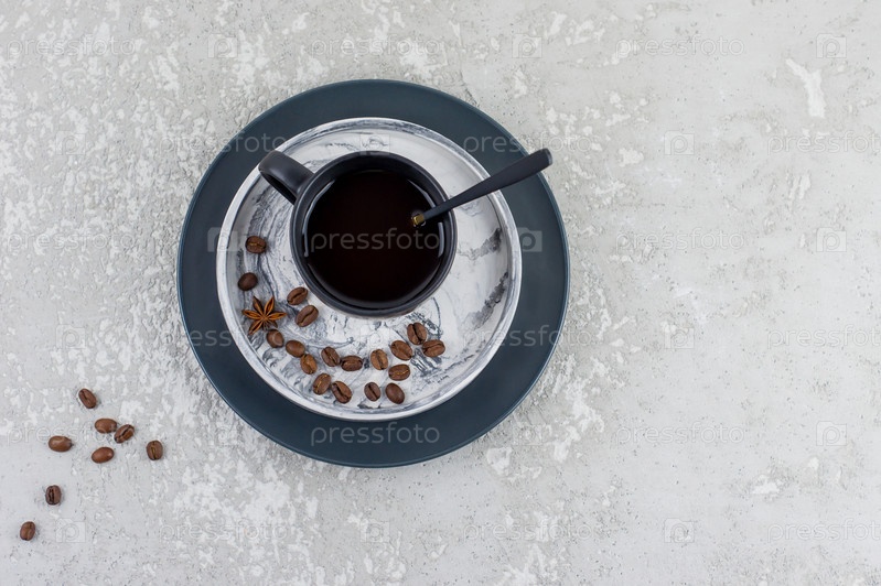 Темная керамическая чашка с эспрессо на гипсовом подносе с кофейными зернами стоит на сером бетонном столе. вид сверху. копия пространства