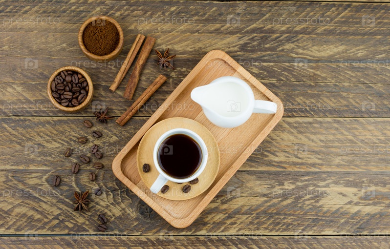 Вид сверху на деревянный поднос с чашкой эспрессо, кофейным ассортиментом и молочником с молоком. коричневый деревянный фон