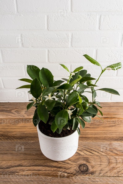 Цитрусово-мандариновое мини-дерево в белом керамическом горшке на деревянном столе у стены из белого кирпича. модный тренд в домашнем интерьере