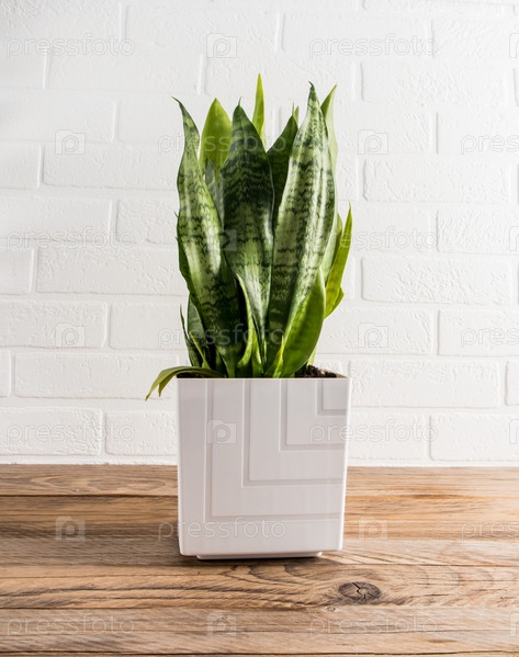 Красивая сансевиерия в белом керамическом горшке на деревянном столе у стены из белого кирпича. домашнее хозяйство