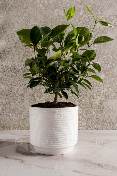 Цитрусово-мандариновое мини-дерево в белом керамическом горшке на мраморном столе у серой стены. модный тренд в домашнем интерьере