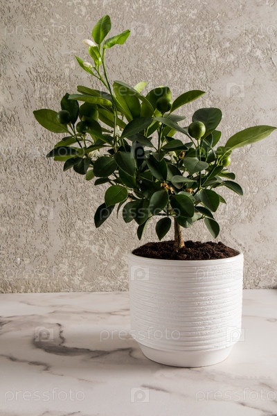 Красивое цветущее цитрусовое дерево в белом керамическом горшке на мраморном столе у серой стены. домашнее хозяйство