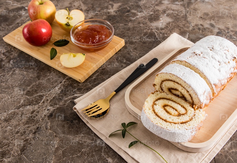 Домашний вкусный бисквитный рулет на деревянном подносе с ингредиентами для выпечки на мраморно-коричневом фоне