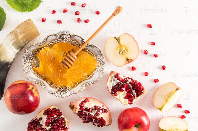 Красивый праздничный фон еврейского Нового года Рошашан. традиционные символы праздника на белом столе. вид сверху. плоская укладка