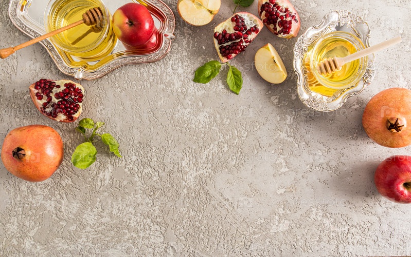 Плоская планировка символов еврейского Нового года Рош ха-Шана. бетонный фон. вид сверху. место для вашего текста