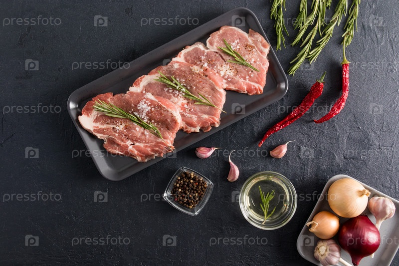 Вид сверху на черный фон с подносом из приготовленных стейков из свинины для выпечки со специями и розмарином. вкусная еда