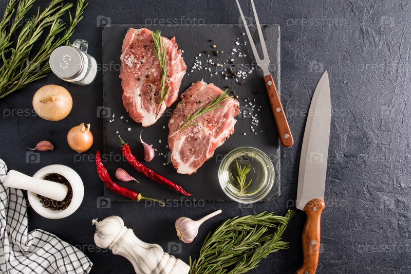 Два сырых стейка из свиной шеи на каменной доске для специй в окружении ингредиентов для приготовления пищи. нож, вилка для удобства нарезки. вкусная еда