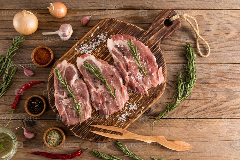 Три стейка из фермерской свинины на деревянной деревенской кулинарной доске с ингредиентами для приготовления пищи. вид сверху. деревенский стол