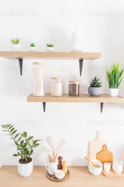Вид спереди на современные кухонные открытые полки с банками для хранения продуктов и комнатных растений в горшках. часть столешницы с кухонной утварью