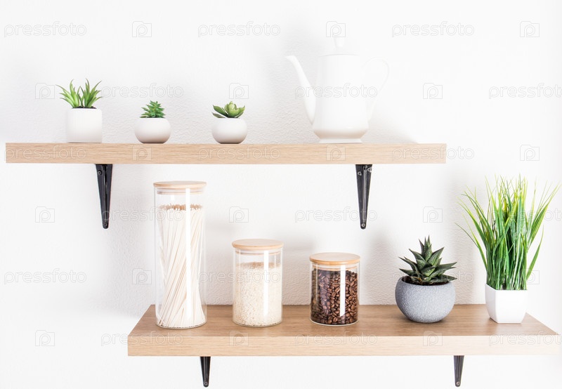Открытые деревянные полки на белой фактурной стене с банками для жарки продуктов и горшками с комнатными растениями. интерьер современной кухни