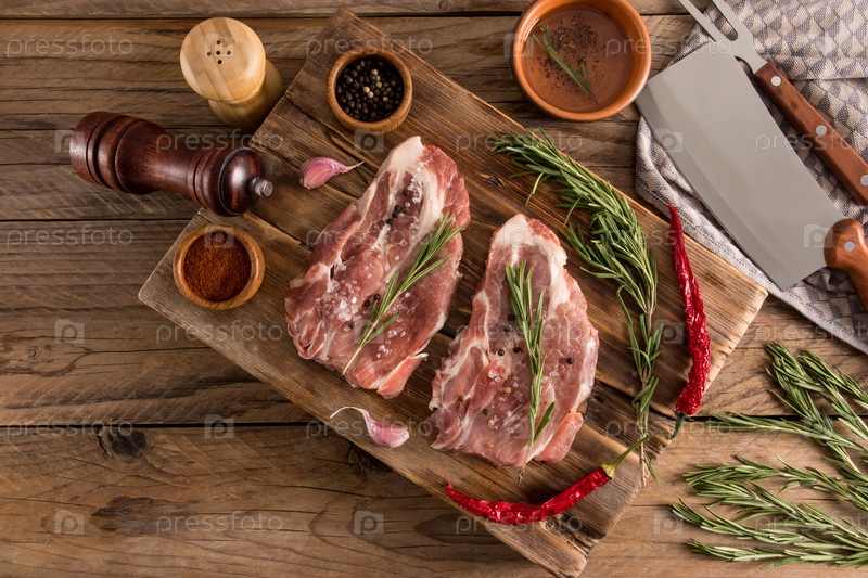 Вид сверху на деревянный стол со свиными стейками на гриле из фермерского мяса. специи для приготовления пищи на деревянной доске
