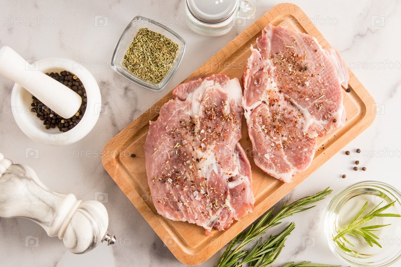 Сырые стейки из свинины на пару на кухонной разделочной доске и мраморный стол со специями и веточками розмарина. вид сверху