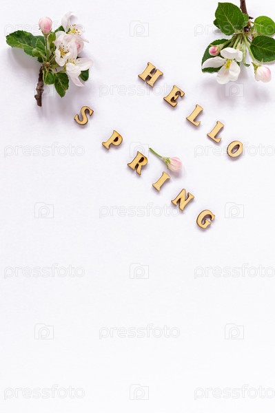 Здравствуйте весенние деревянные буквы на белом фоне с весенними цветами и бутонами яблони. Вертикальный фон. копия пространства