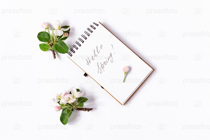 Страница с весенними цветами и бутонами табони с рукописным текстом-hello spring.top view. макет праздничной открытки