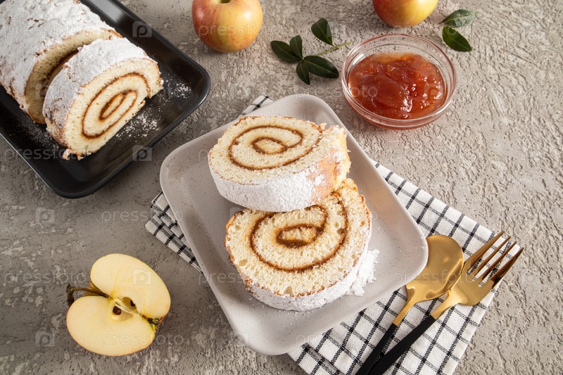 Домашний незастегнутый фруктовый рулет на серой керамической прямоугольной тарелке на тканевой салфетке. вкусный десерт, закуска. серый фон