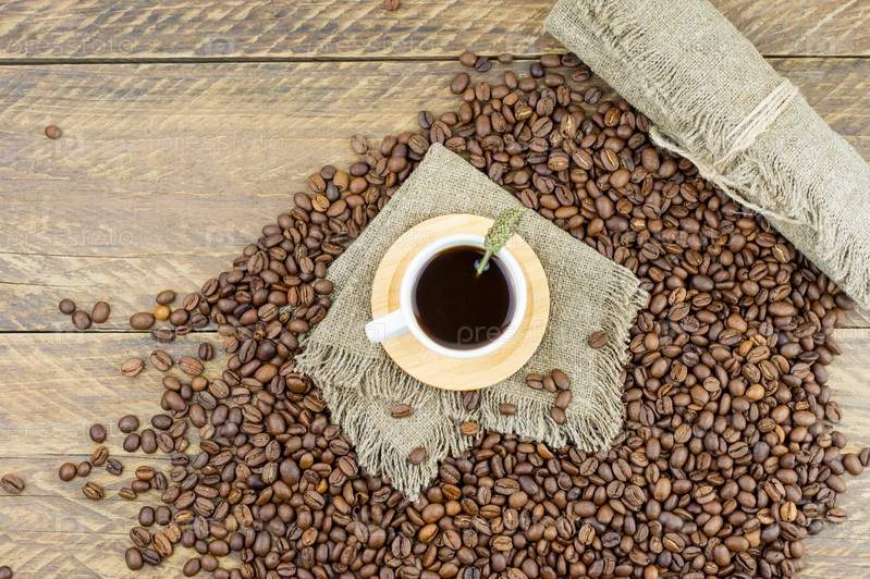 Свежеприготовленный кофе в чашке на деревянном деревенском столе и кофейных зернах. вид сверху. деревенский стиль