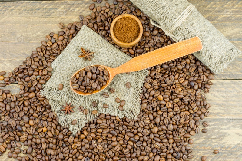 Деревянная ложка с кофейными зернами и миска молотого кофе на деревянном столе и кофейные зерна. вид сверху