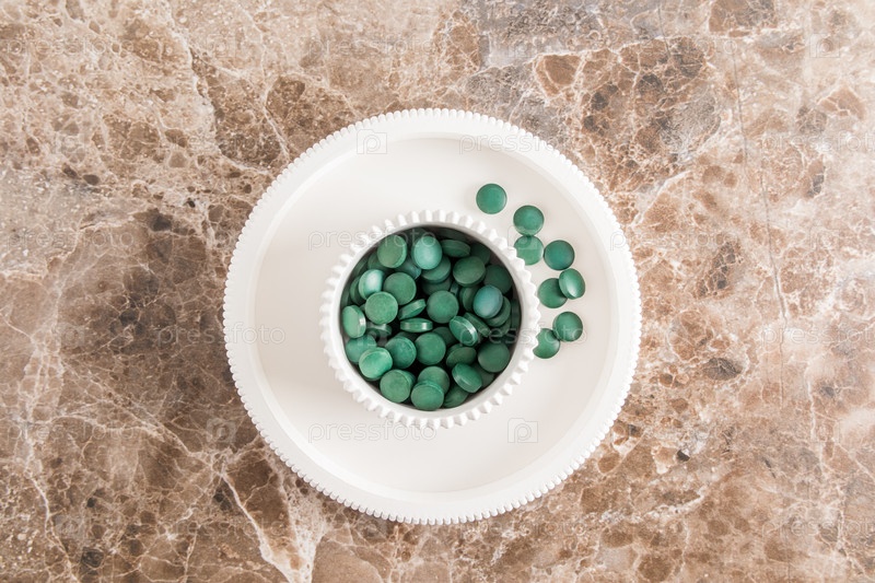 Вид сверху на белую тарелку таблеток спирулины на фоне коричневого мрамора. концепция укрепления организма, очищение от такси