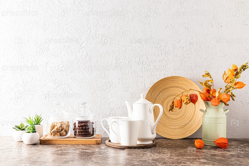 Кухонная мраморная столешница с кофейником и кружками, банки с сахаром и кофе, кувшин с сухоцветами на серой фактурной стене. пространство для копирования