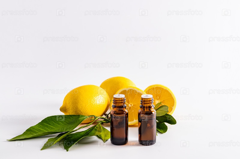 Вид спереди на две медицинские бутылки с эфирным маслом лимона напротив спелых фруктов. белый фон. Пустой макет для презентации продукта