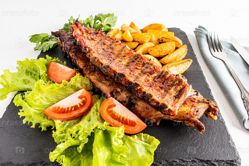 Большой вид свиных ребрышек на грифельной доске с зеленью салата, ломтиками помидоров и картофелем на гриле. концепция еды, приготовленной на заднем дворе