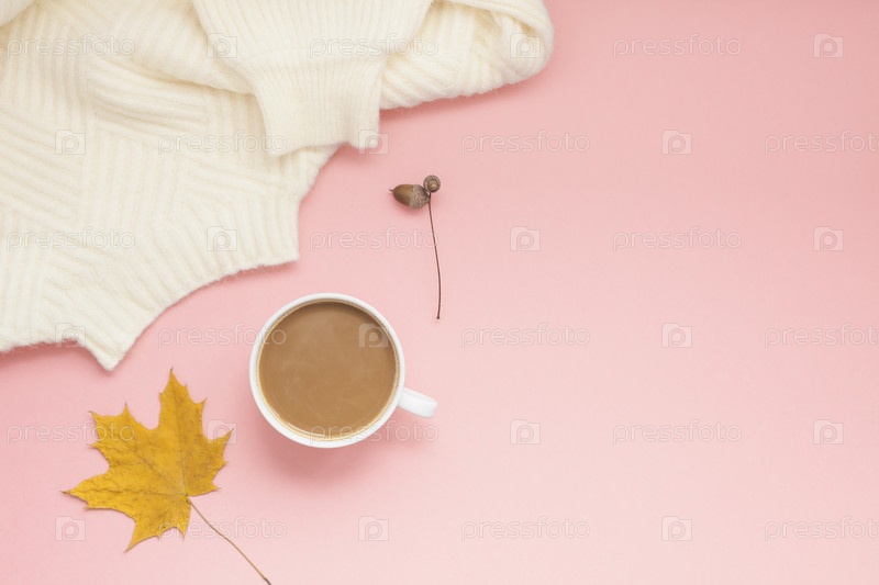 Чашка кофе и белый свитер на розовом фоне