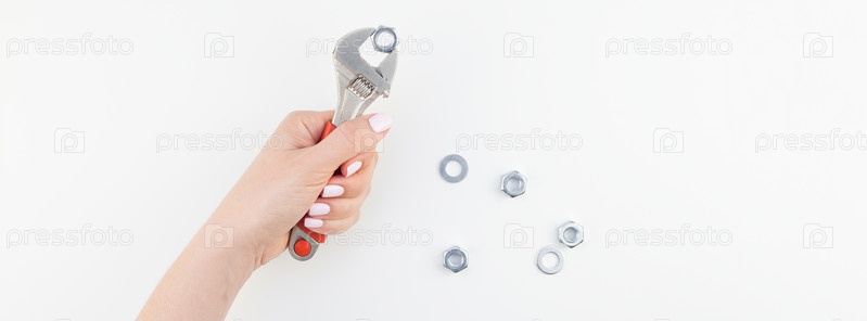 Женская рука держит гаечный ключ на белом фоне