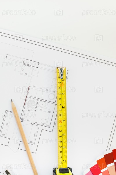 Рабочее место дизайнера интерьера с планом дома