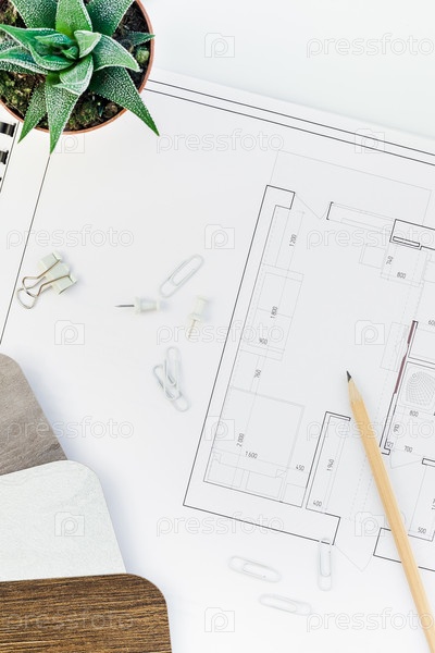Рабочее место дизайнера интерьера с планом дома