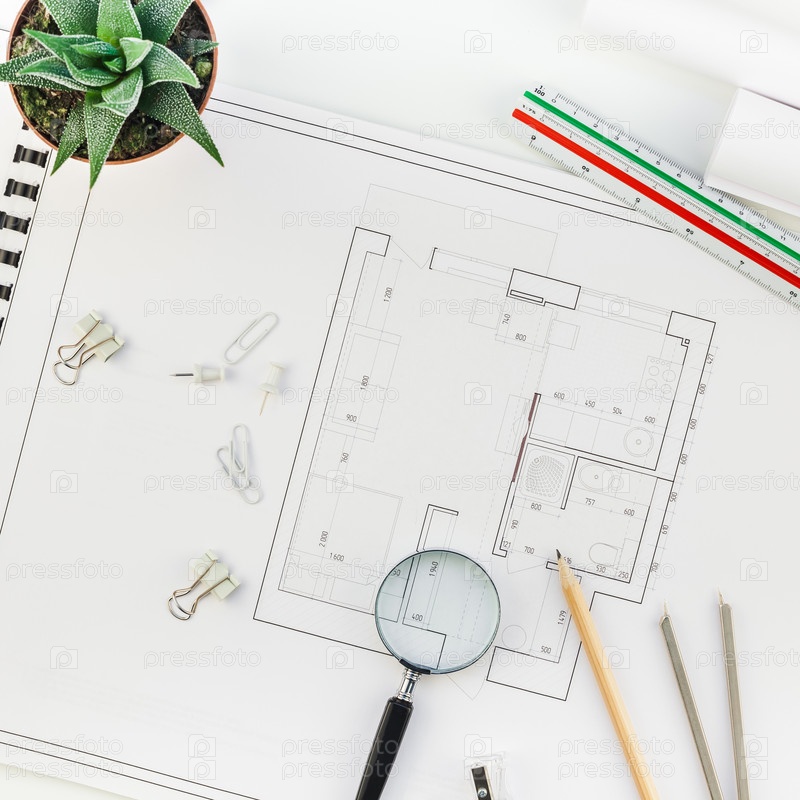 Рабочее место дизайнера интерьера с планом дома