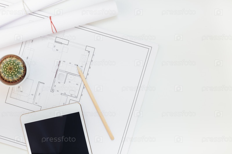 Рабочее место дизайнера интерьера с планом дома