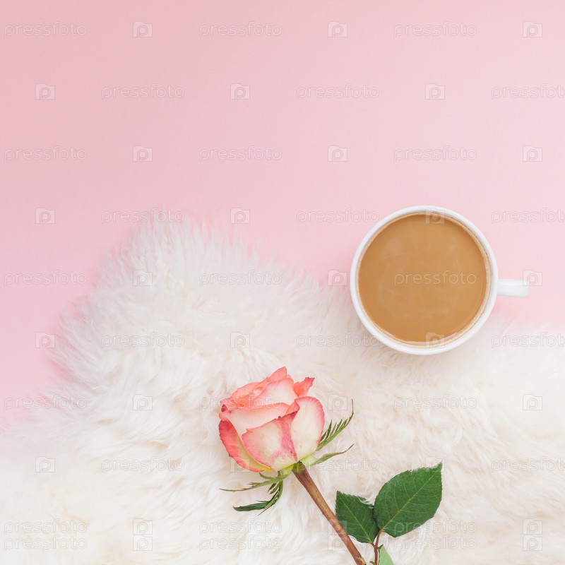 Чашка кофе и цветок розы на розовом фоне