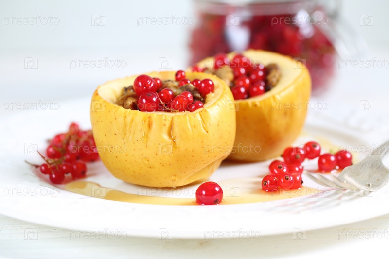 Печеные яблоки с медом,грецкими орехами , смородиной на белом фоне