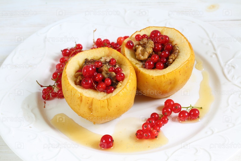 Печеные яблоки с медом,грецкими орехами , смородиной на белом фоне