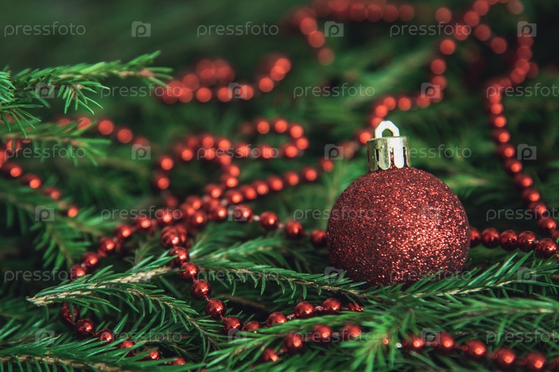Фоновая текстура ветвей елки с красными безделушками и бисером