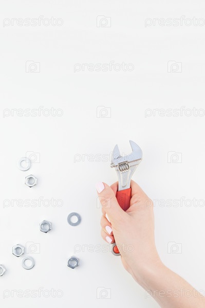 Женская рука держит гаечный ключ на белом фоне