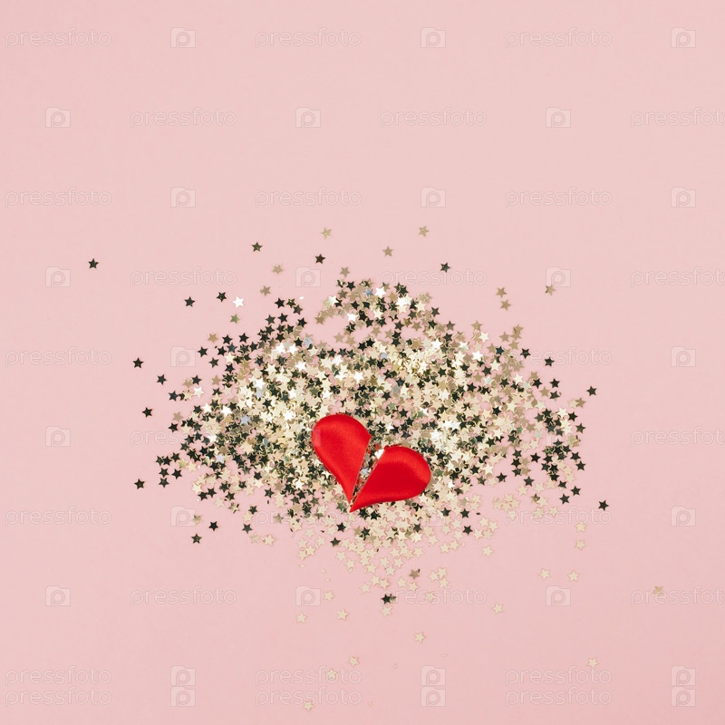 Вид сверху на разбитое сердце конфетти с золотыми звездами