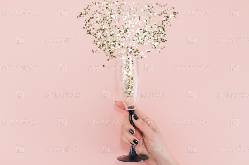 Бокал шампанского вылил конфетти золотыми звездами