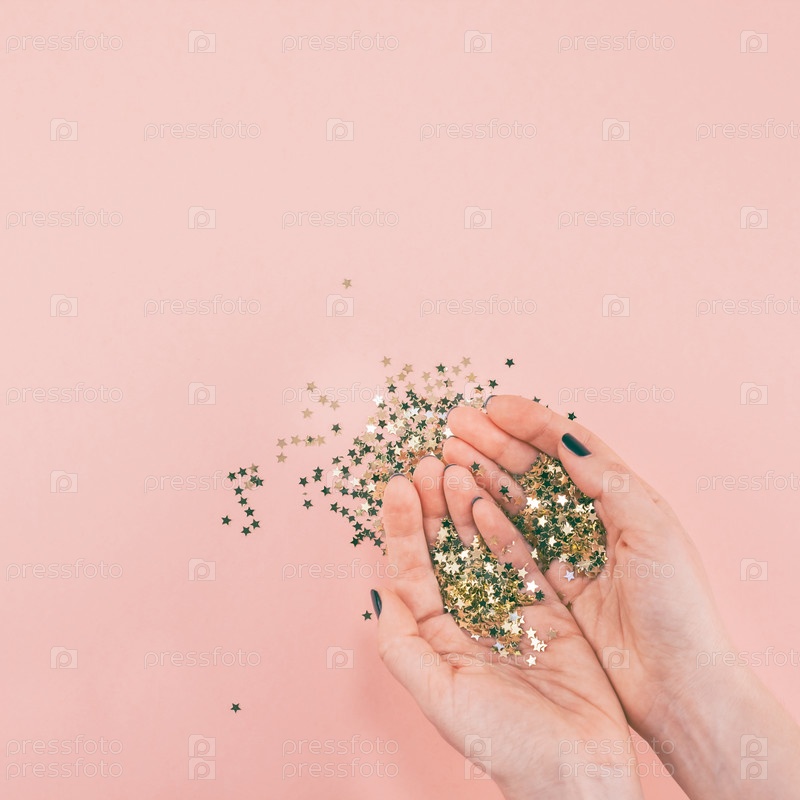 Женские руки покрыли конфетти золотыми звездами на розовом