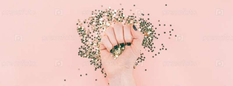 Женские руки покрыли конфетти золотыми звездами на розовом
