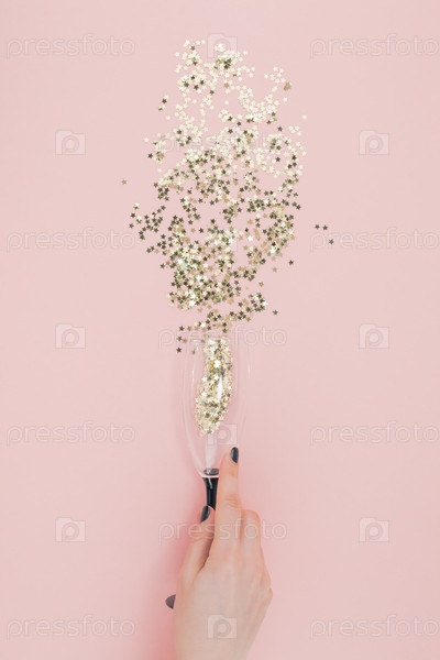 Бокал шампанского вылил конфетти золотыми звездами