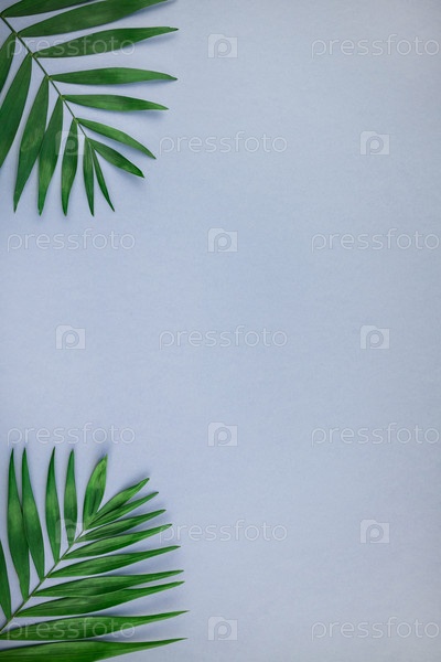 Тропические пальмовые листья на синем фоне серой бумаги