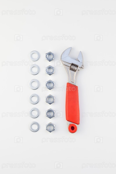 Плоская укладка металлических гаек и гаечного ключа