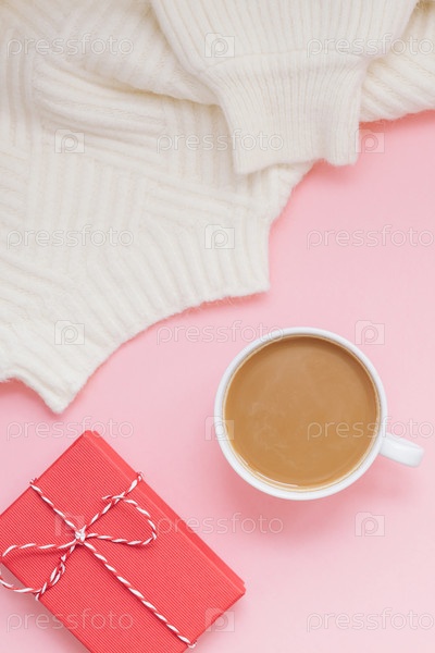 Кофейный свитер и красный подарок на розовом фоне