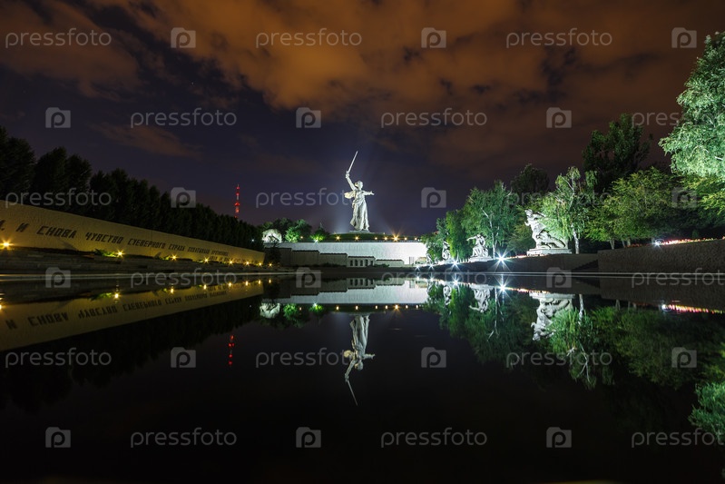 Россия, Волгоград - 28 августа 2017 г.: Закат. Скульптура Родина-мать зовет! - композиционный центр памятника-ансамбля Героям Сталинградской битвы на Мамаевом кургане