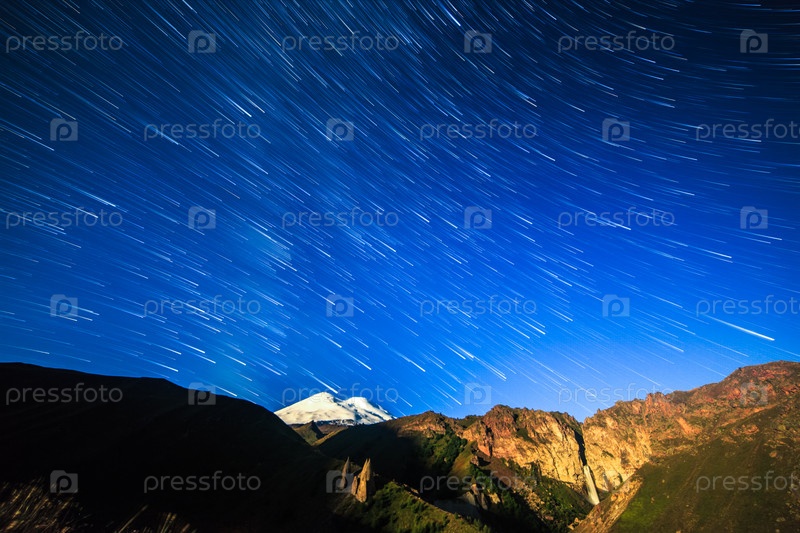 Звезды рисуют угасающие линии и облака над Эльбрусом. Ночной пейзаж. Россия