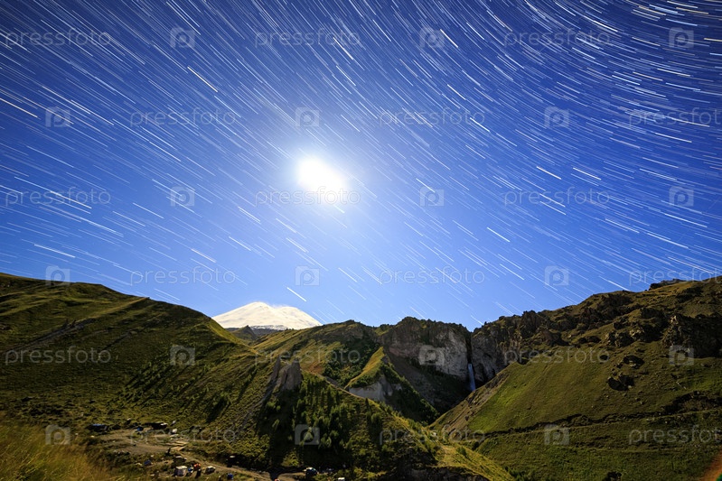 Луна над Эльбрусом. Ночной пейзаж. Россия. Следы в виде линии от звезд