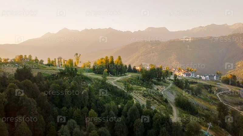 Плато Роза Хутор, постройки, склоны и кресельные подъемники. Вид с воздуха на закате