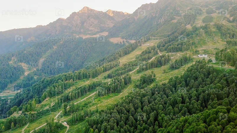 Плато Роза Хутор, постройки, склоны и кресельные подъемники. Вид с воздуха на закате